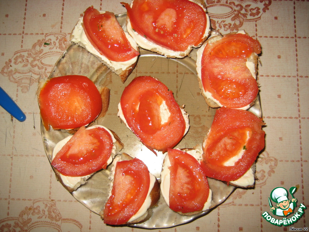Режем батон. Желательно, его обжарить. Смазываем кусочки майонезом, чтобы пропитались. На каждый бутербродик режем помидор кружочками.
