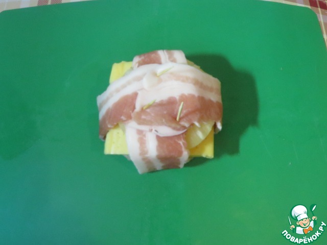 Тонкие ломтики бекона положить крест-накрест, по желанию чуть посолить.