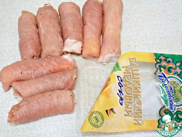 Мясо нарезать на куски толщиной 1.5 см. Хорошенько отбить, посолить, поперчить. Упаковку с сыр " Башкирский медовый" аккуратно вскрыть.