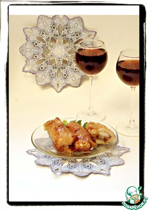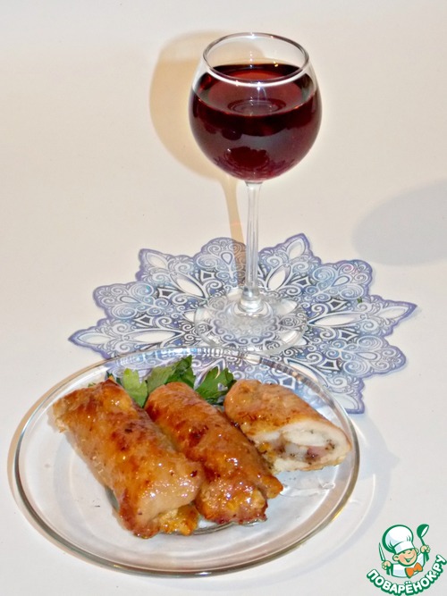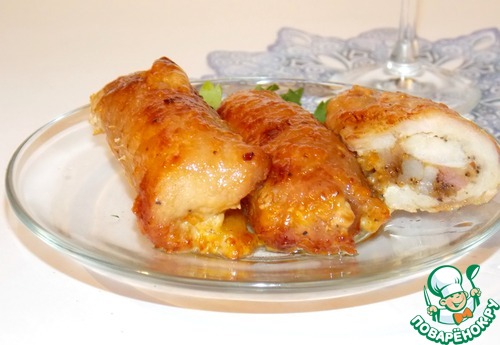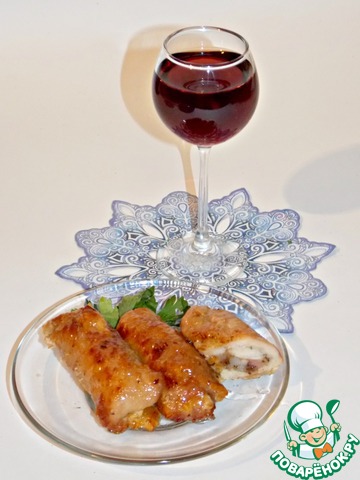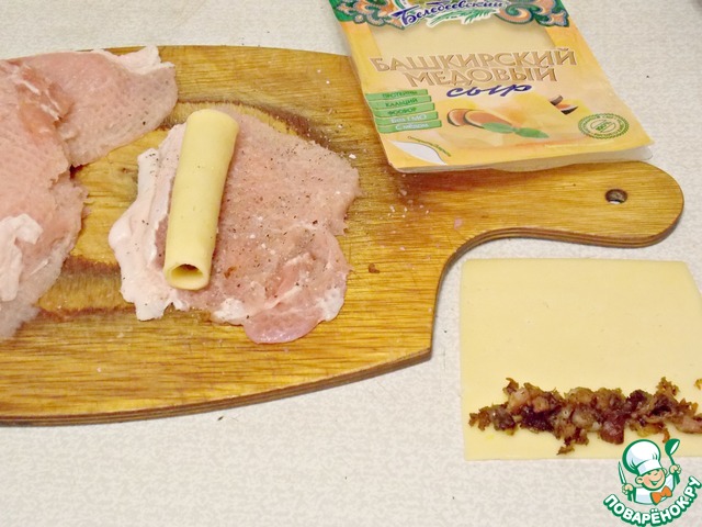 Положить начинку на край сыра и скатать трубочку. Кладем ее на край отбитого мяса и сворачиваем рулетом.