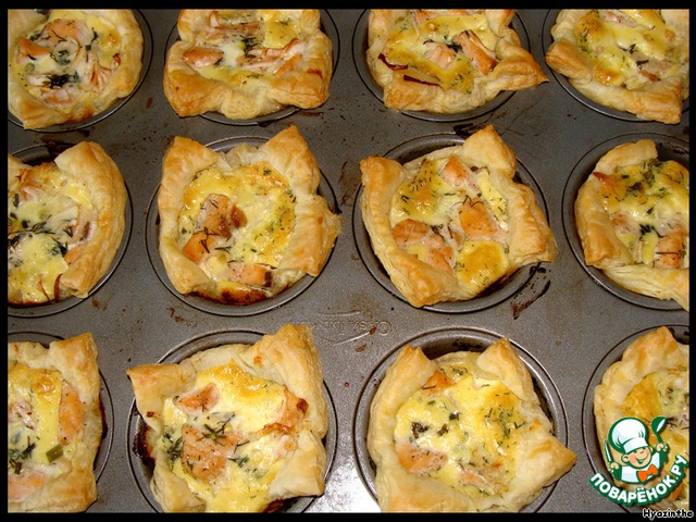 Пласт тесто разрезаем на 12 прямоугольников, выкладываем в смазанные маслом формочки (у меня форма для маффинов, тарталетками еще не разжилась :( )