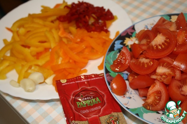 Помидоры нарезаем произвольно. Болгарский перец полосочками, пеперони по вкусу. Если нравится острота, то берите две штуки, если нет, то один.