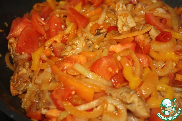 Сначала обжариваем курицу до легкой золотистости, потом добавляем лук и паприку, у меня одна острая, а другая сладкая. Обжариваем все около 7 минут.