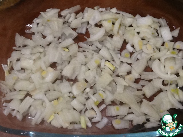 Затем в посуде, подходящей для запекания в духовке, сделаем овощную подушечку. Сначала лук крупно порежем.