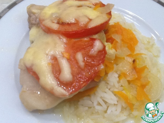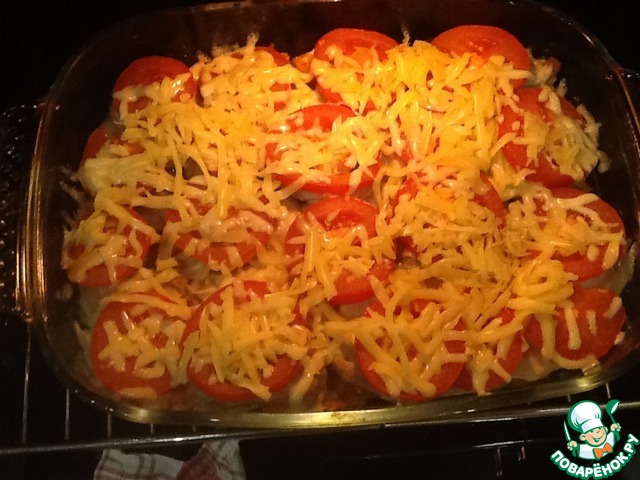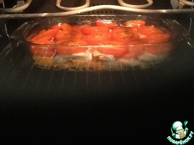 Сверху выложим филе и помидорки кружочками. Опять чуть присолить и отправляем в разогретую до 180 градусов духовку минут на 20.