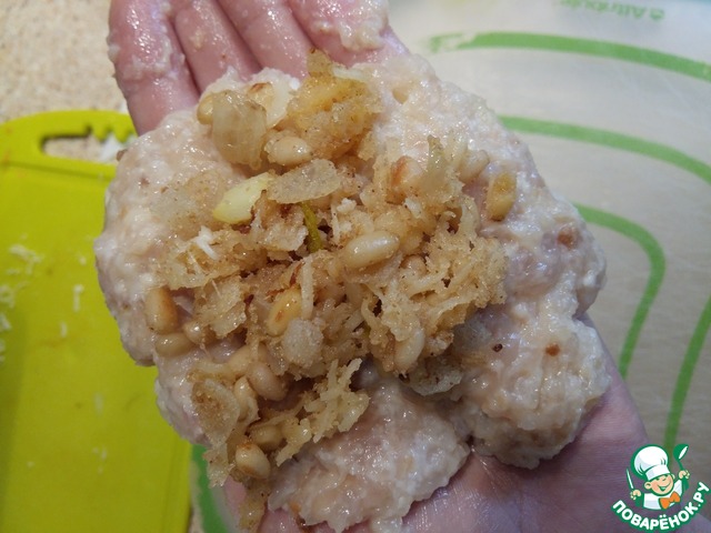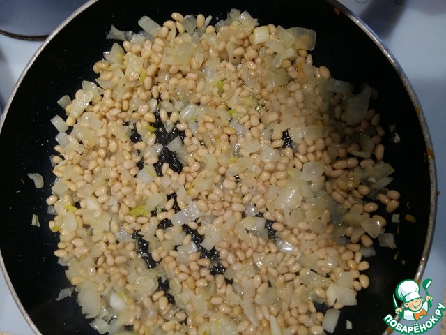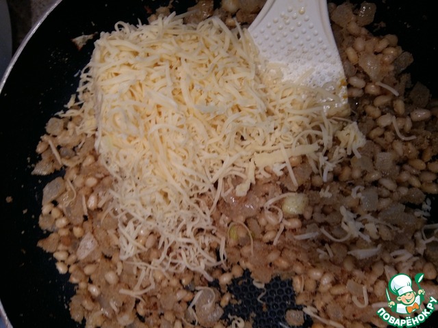Добавляем к луку кедровые орехи и ещё немного обжариваем, добавляем панировачные сухари, прогреваем и оставляем остывать