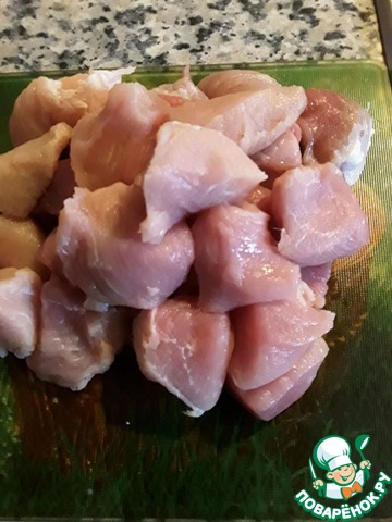 Мясо моем, обсушиваем и нарезаем небольшими кусочками.