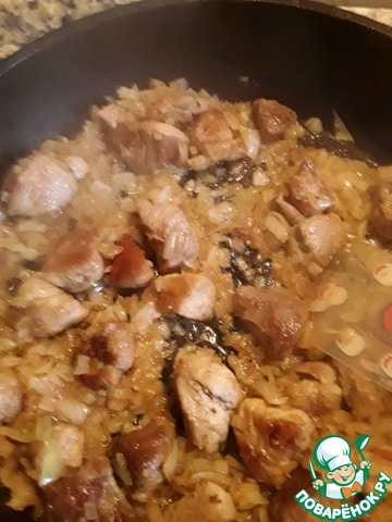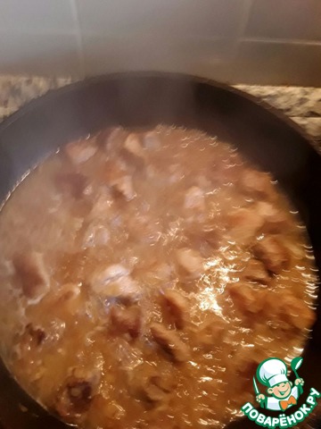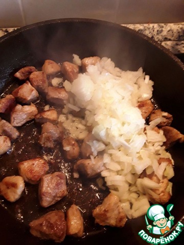 А пока наше мясо приобрело красивый цвет и выглядит примерно так. Как раз пришло время добавить лук.