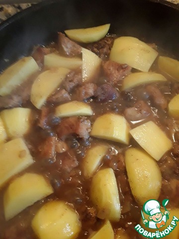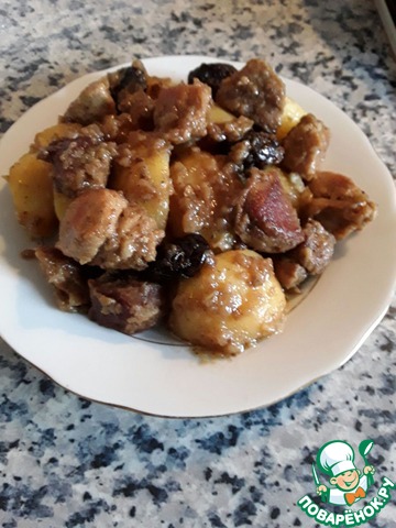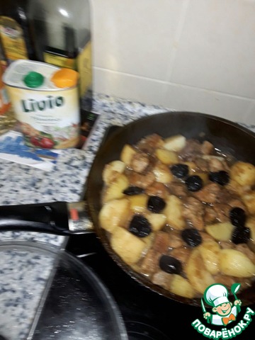 | Сегодня я хочу поделится с начинающими хозяюшками ещё одиним способом приготовления жаркого. Это жаркое остаётся вкусным и на второй день из- за способа его приготовления, т. к. во время приготовления этого блюда вся вода выпаривается и картошка остаётся целая и упругая, а не размокает в подливе от жаркого. К тому же оно получается очень ароматным за счёт чернослива, но это все на любителя, так что можно готовить и без него. |