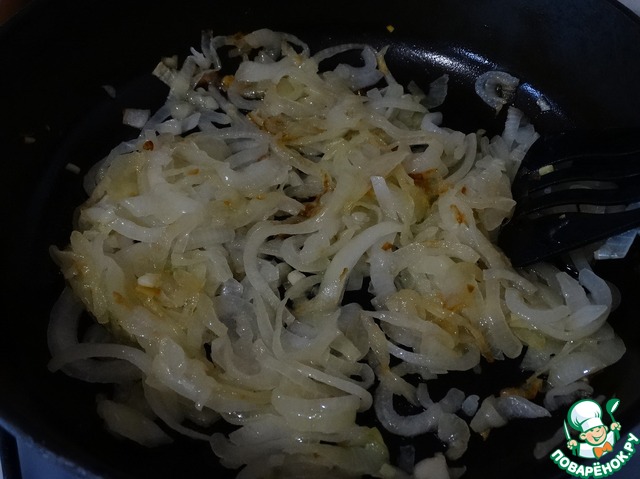 Остальной лук очищаем, нарезаем полукольцами и обжариваем до прозрачности на сливочном масле.