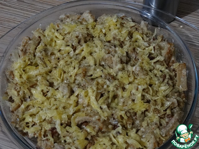 Перекладываем в жаропрочную посуду, посыпаем тертым сыром и помещаем в духовку на 10 минут.
