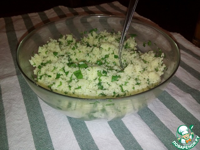 Делаем кускус. На 1 стакан крупы - 2 стакана кипятка. Даём настояться, пока вода полностью не впитается. Готовую крупу солим, я добавляю паприку, иногда тимьян. Зелень рубим мелко-мелко, добавляем.