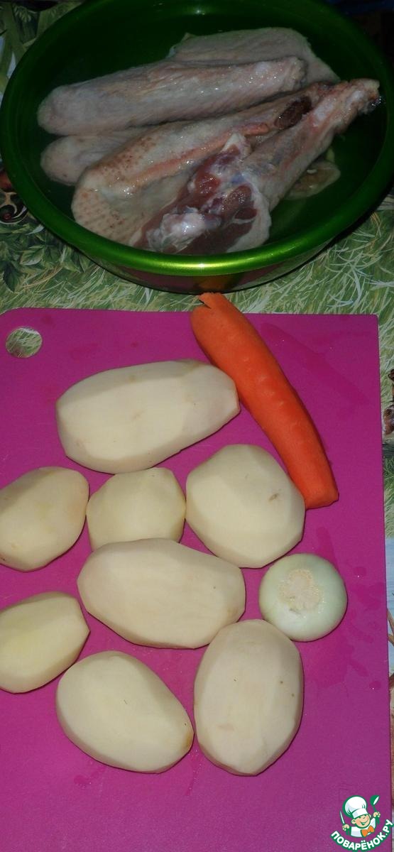 Подготовим ингредиенты. Гуся надо предварительно замочить в прохладной соленой воде и лучше это сделать на ночь, чтобы мясо было мягким. У меня из-за незапланированности, крылышки отмачивались всего несколько часов