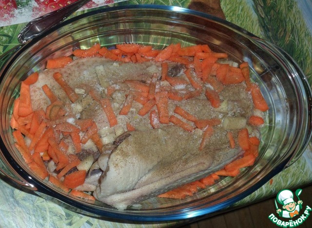 Закрываем форму крышкой и ставим в холодную духовку (зажигаем только после того, как поставим форму с гусем) и засекаем примерно полтора часа после того, как духовка нагреется (220-230 градусов). Обратите внимание на количество воды (увеличилось примерно на 1 см).
