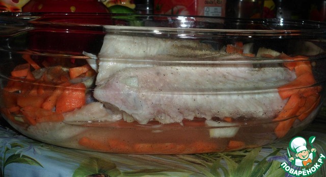 Залить дно водой, чтобы она немного покрывала мясо (у меня 3 литровая форма, я ее заполнила примерно на 2-3 см)