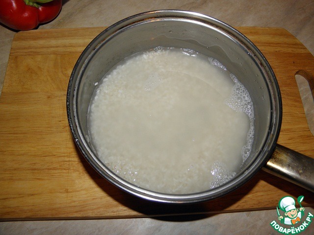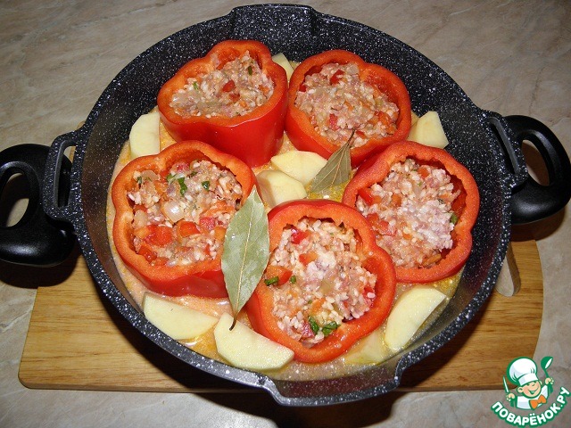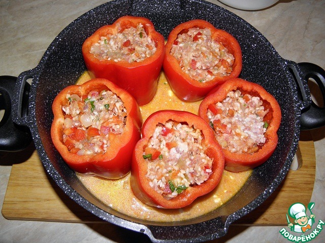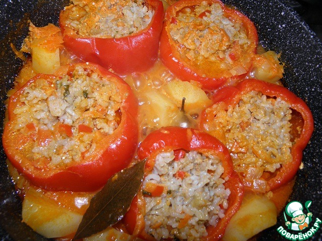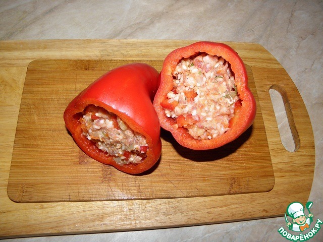 Наполнить фаршем перцы не плотно, рис при тушении еще увеличится в объеме