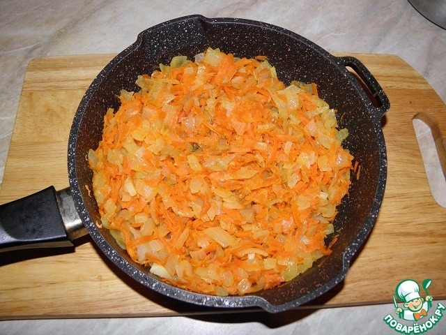 Лук нарезать, морковь натереть на терке, обжарить на растительном масле (одна часть зажарки у нас пойдет в фарш, другая в подливку)