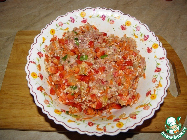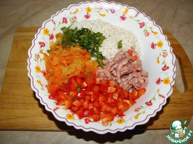Воду с риса слить, соединить фарш, рис, нарезанный кубиком сладкий перец, мелко нарезанную петрушку, половина зажарки лука с морковью, чеснок (по желанию), посолить поперчить
