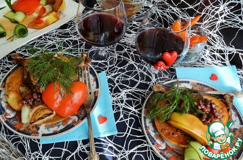 Накрывайте на стол. К утке добавьте жареные лук и перец, подайте красное вино.
