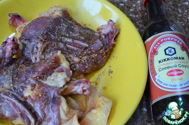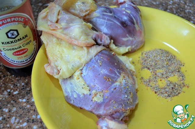 Ножки утки вымыть, обсушить. Кожу аккуратно снять, не разрывая и оставить на косточке. Обмазать мясо смесью перцев.