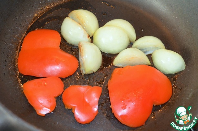 Лук порезать на четвертинки, перец кусочками. Не поленитесь, нарежьте фигурно. Обжарить на растительном масле до готовности. Отложить.