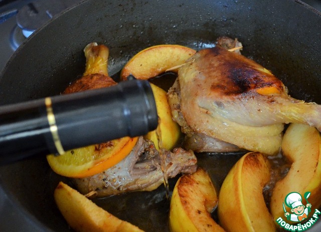 Влить вино, накрыть крышкой, убавить огонь и тушить до готовности утки, от 20 до 45 минут.