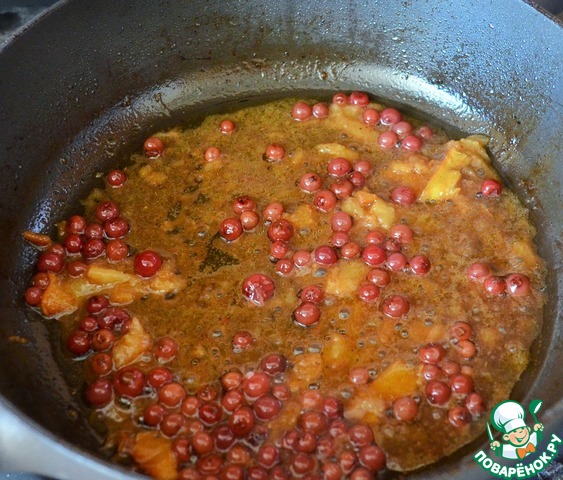 Утку ( убрать зубочистки ) и айву выложить на блюдо, а в оставшееся на сковороде добавить бруснику, сок 1/2 апельсина (1,5 - 2 ст. л.), прокипятить пару минут.