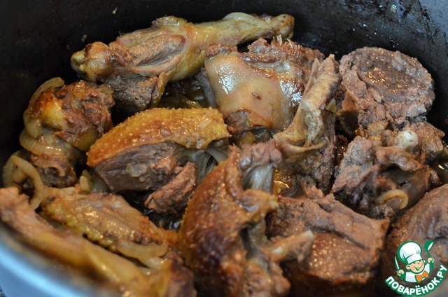 В казане на 3 - 4 л. растопить масло и обжарить куски утки.