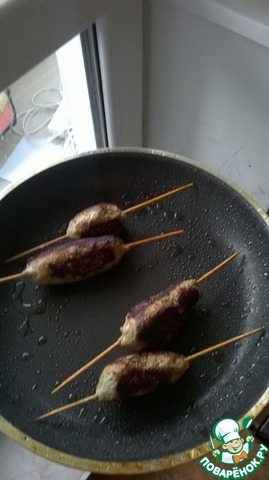 Фарш смешать с мелконарезанным луком и зеленью (укроп, петрушка), посолить, поперчить, сформировать длинные котлетки, проколоть шпажкой и обжарить на сковородке с каплей растительного масла.
