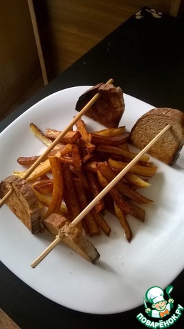 Картофель очистить, нарезать длинными брусочками как на картошку-фри и обжарить в масле на сковородке. Я старалась не класть много сразу, чтоб не склеились и были похожи на картошку-фри. Положить нашу картошку на тарелку - это дрова в костре. Пару кусочков хлеба обжарить в тостере или на сковородке, чтоб затвердели. Проколоть палочками для суши - получится импровизированный мангал.