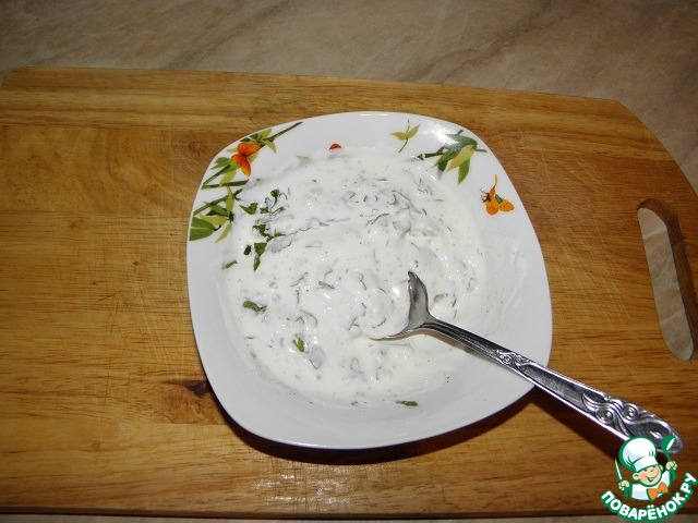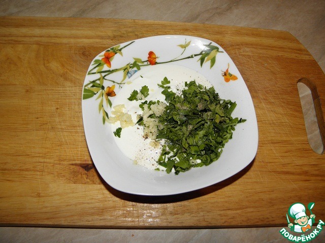 Подготовить соус: В сметану добавить измельченную зелень. чеснок (через пресс), специи соль, перец