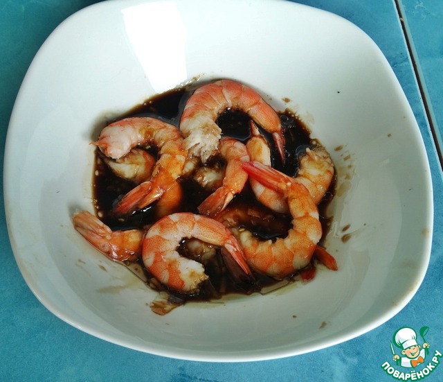 Добавить ссахарную пудру, бальзамический уксус, соевый соус, в котором мариновались креветки, сок и цедру апельсина. Довести до кипения, убавить огонь и держать до карамелизации. Выключить. Остудить.