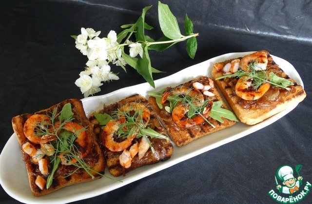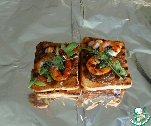 Креветки и белый хлеб для тостов обжариваем на сковороде-гриль. На хлеб выкладываем карамелизованный лук. Сверху кладём по листочку рукколы, по две королевских креветки и украшаем веточкой укропа.