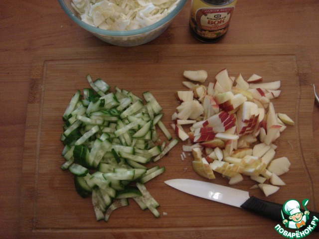 Берём посуду с толстым дном, наливаем масло и разогреваем его. Выкладываем сразу капусту, яблоко, огурец. Тушим 30 минут, периодически мешая.
