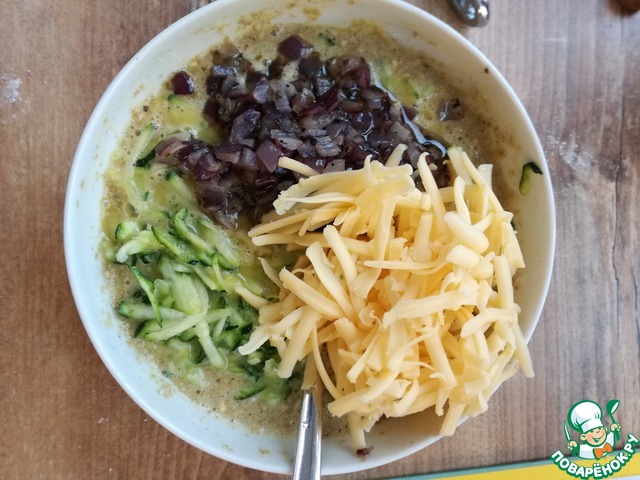 Затем добавляем: цуккини, лук из сковороды и тертый сыр. все перемешиваем, пробуем на соль и перец.