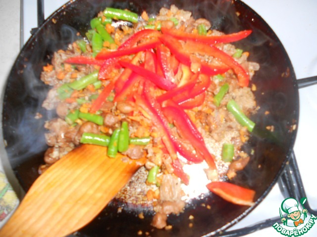 Посолить, поперчить по вкусу, добавить нарезанный сладкий перец. Перемешать и обжаривать в течении 4-5 минут.