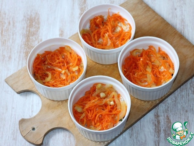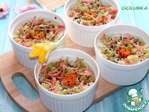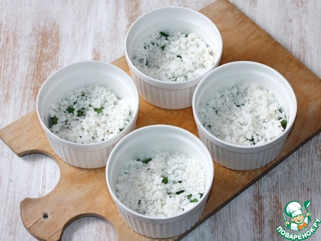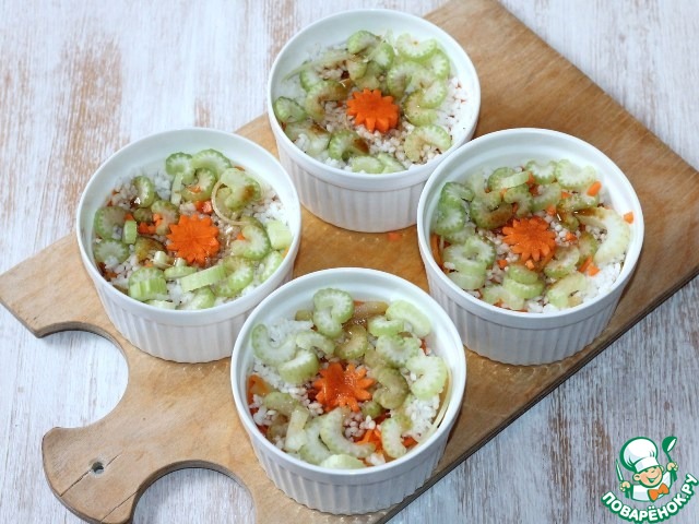 9... рис и порезанный дольками сельдерей. Поливаем сверху соусом, накрываем формочки фольгой или крышкой и ставим в разогретую до 200 С духовку на 30 минут или до готовности овощей и риса.