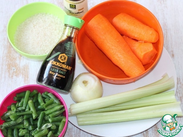 1. Продукты для приготовления. Овощи очищаем и моем. Рис промываем.