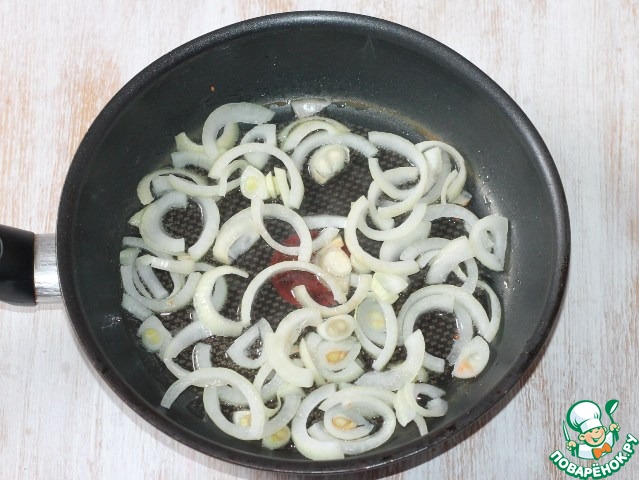 3. В ароматизированное масло кладем порезанный полукольцами репчатый лук, обжариваем до прозрачности.