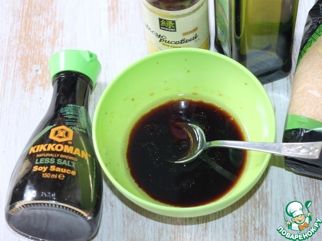 5. Приготовим соус. В маленькой миске смешиваем соевый соус, сахар, оливковое (2 ст. л.) и кунжутное масло, рисовый уксус. Пробуем и корректируем вкус. Откладываем миску с соусом в сторону.