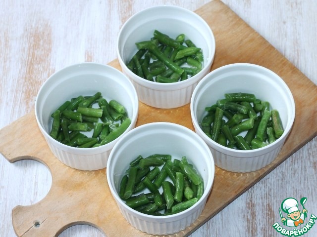 6. Порционные формочки смазываем (дно) маслом и раскладываем слоями: стручковую фасоль,..
