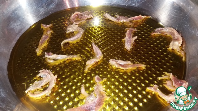 Разогреваем сковороду с маслом и обжариваем в течение 3-4 минут анчоусы.