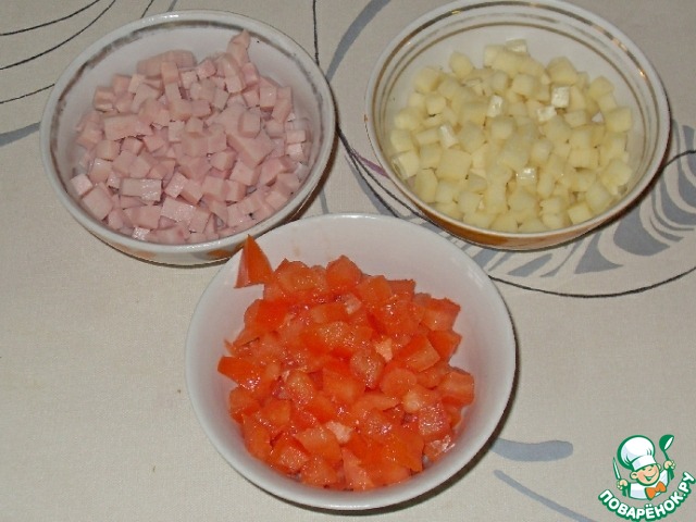 Ветчину, сыр (лучше взять такой, который хорошо плавится: сулугуни, моцареллу) и помидор нарезать маленькими кубиками.