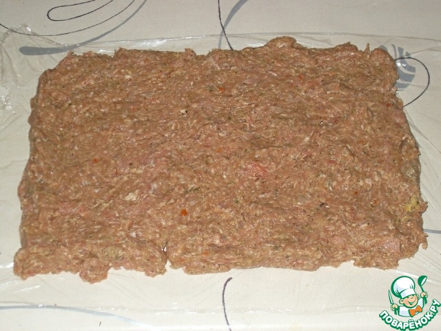 Кусок пленки смазать растительным маслом и разложить фарш в виде толстенького прямоугольника.