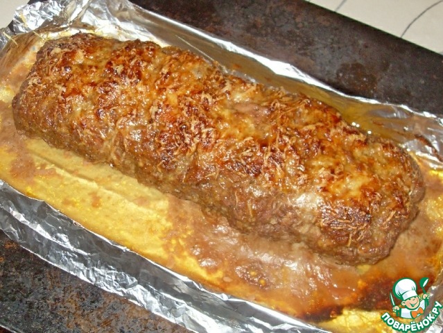 При помощи пленки края фарша поднять над начинкой, соединить и хорошо защипать. Кусок фольги смазать растительным маслом и аккуратно перекатить на неё рулет. Завернуть края фольги наружу в виде бортиков. Поставить рулет в разогретую до 200*С духовку, температуру снизить до 170*С. Запекать 45 минут.