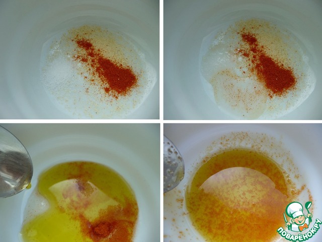 Готовим соус. В чашечке смешать, соль, чесночный порошок, красный жгучий перец, уксус, оливковое масло. Все хорошо взбить ложкой.
