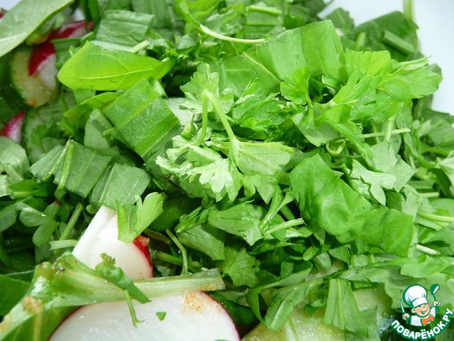 Огурец нарезать полукольцами, редис на сектора, добавить полевой салат.