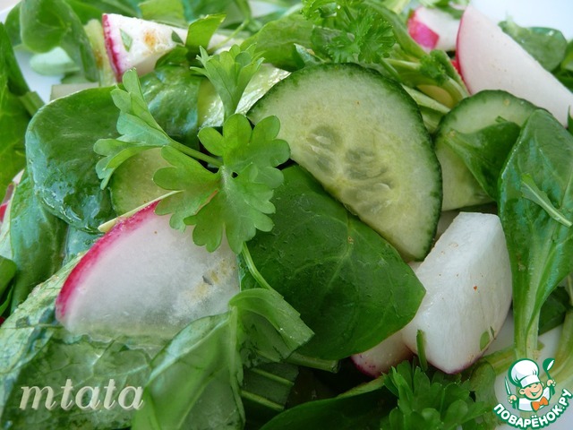 | Предлагаю сочный весенний салатик из огурца, полевого салата и редиса. У нас сейчас редис молодой, очень сочный. Готовить из него салаты одно удовольствие. |