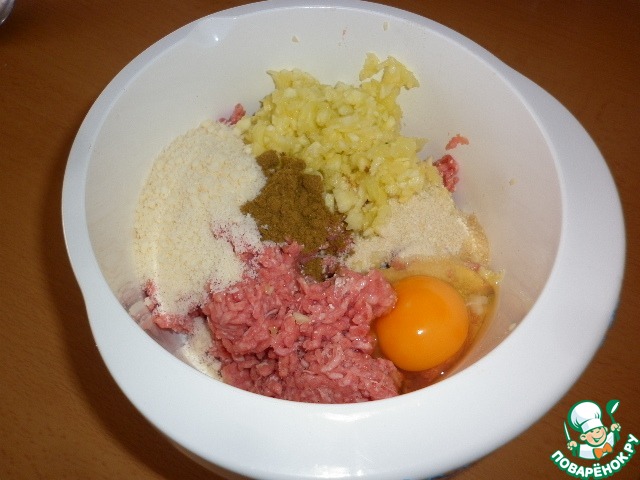 В фарш добавляем пармезан, молотые сухари, яйцо, мякоть цуккини и кумин (зиру). Солим, перчим.