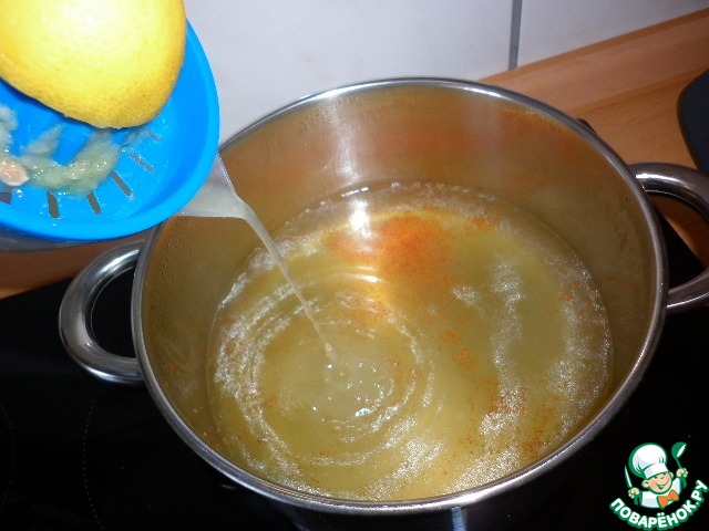 Для подливы-соуса: сок 1 небольшого лимона влить в бульон и довести до кипения (вообще, ориентируйтесь на свой вкус, возможно, сока половины лимона вам будет достаточно). По необходимости посолить, добавить шафран.